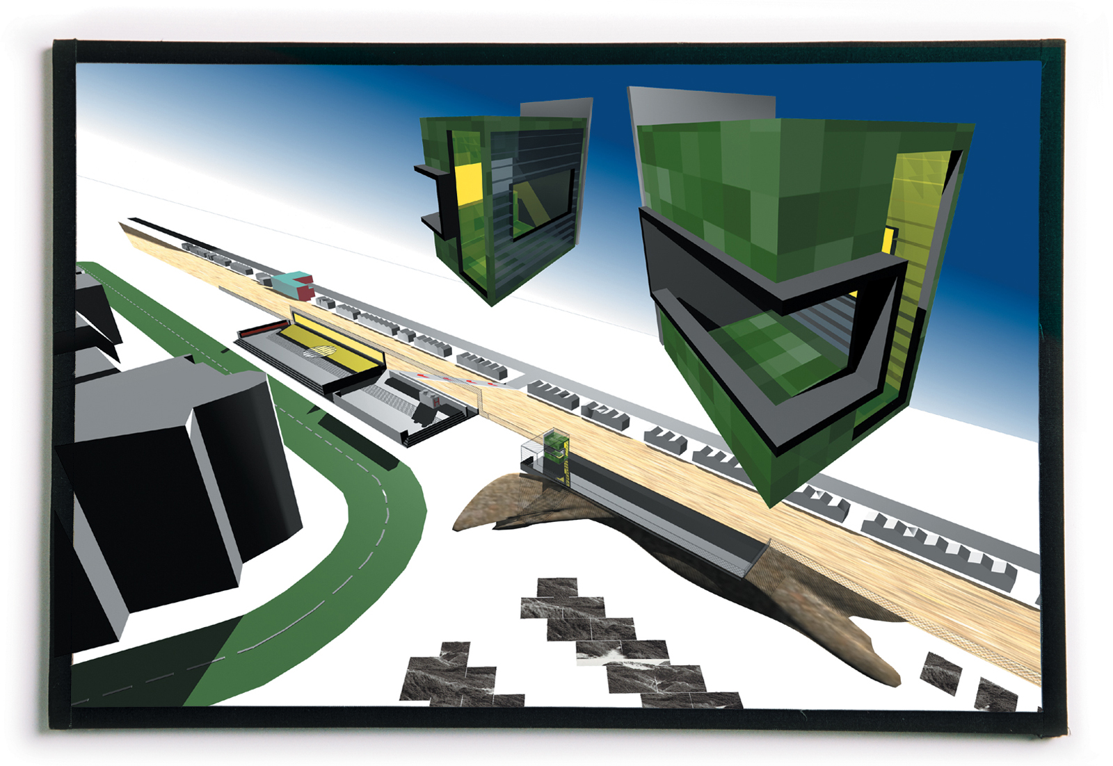 In ons voorstel wordt daarom de boulevard van groen asfalt voorzien en als een landschappelijke ‘groene’ route om de verschillende grote gebouwen heen gekronkeld, waardoor deze ineens als objecten in een ‘Engels landschappark’ gaan fungeren en alzijdige kwaliteiten krijgen.