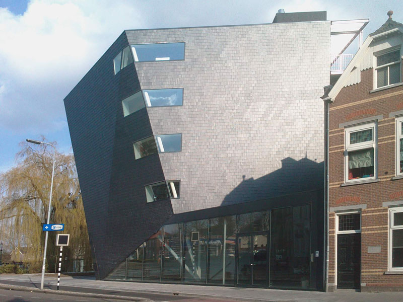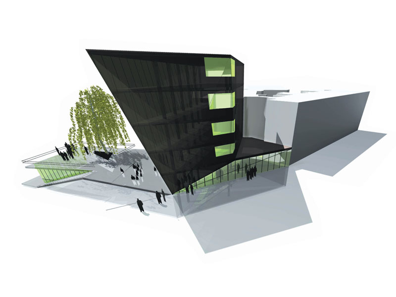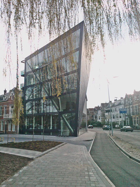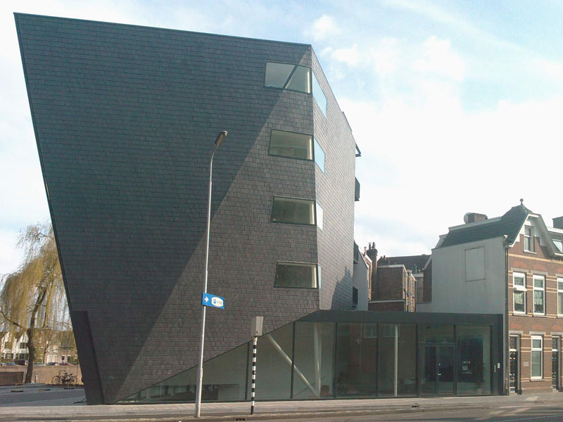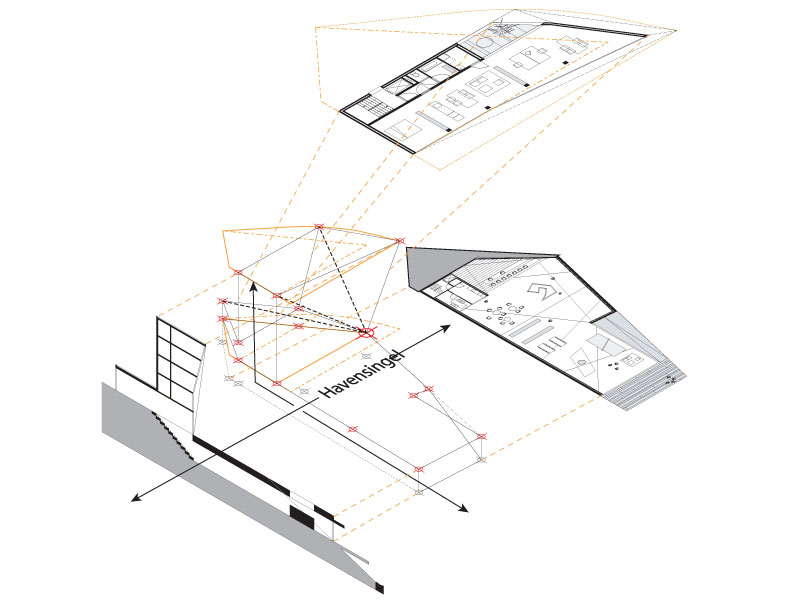 Vanuit de punt van de driehoekige locatie, vertrekken de beeldbepalende lijnen van het project naar de belangrijke punten uit het bestemmingsplan. Een 'Stealth'-achtig gevouwen woongebouw is het resultaat. Ondergronds maakt de bedrijfsruimte een connectie naar het water terwijl er boven op, als een balkon aan het water, een nieuw plein ontstaat.