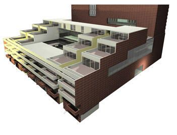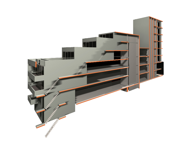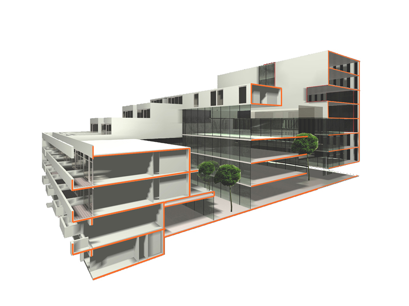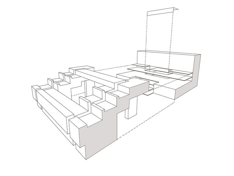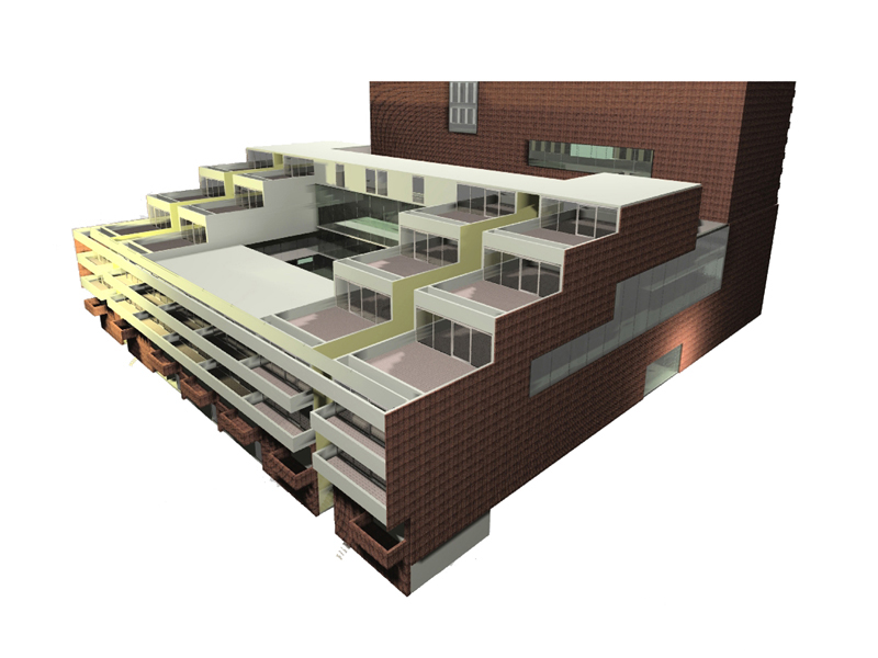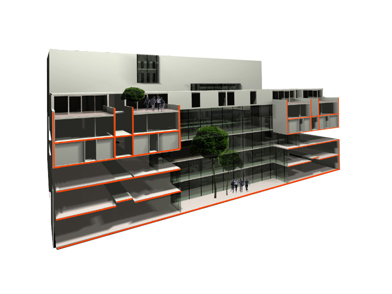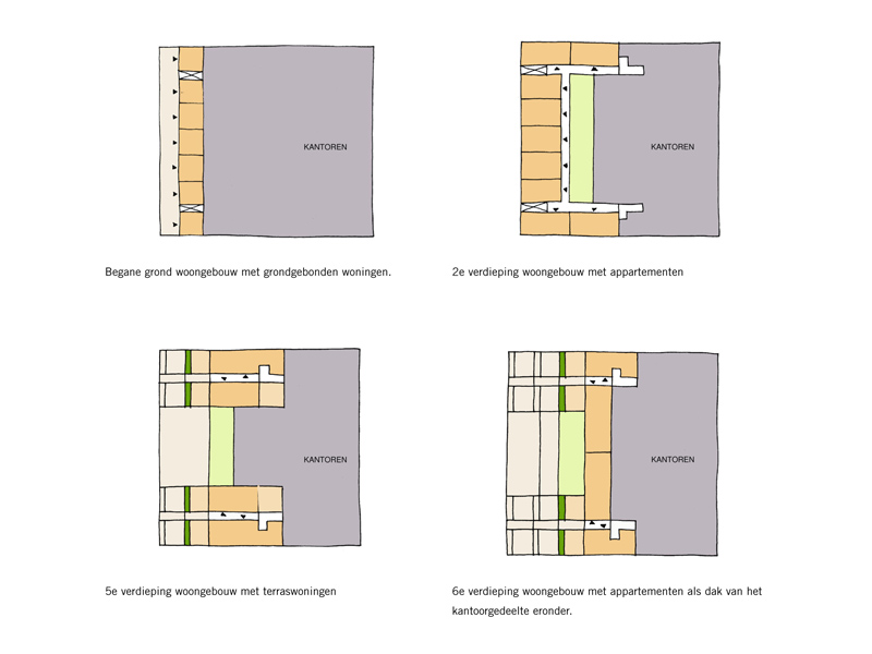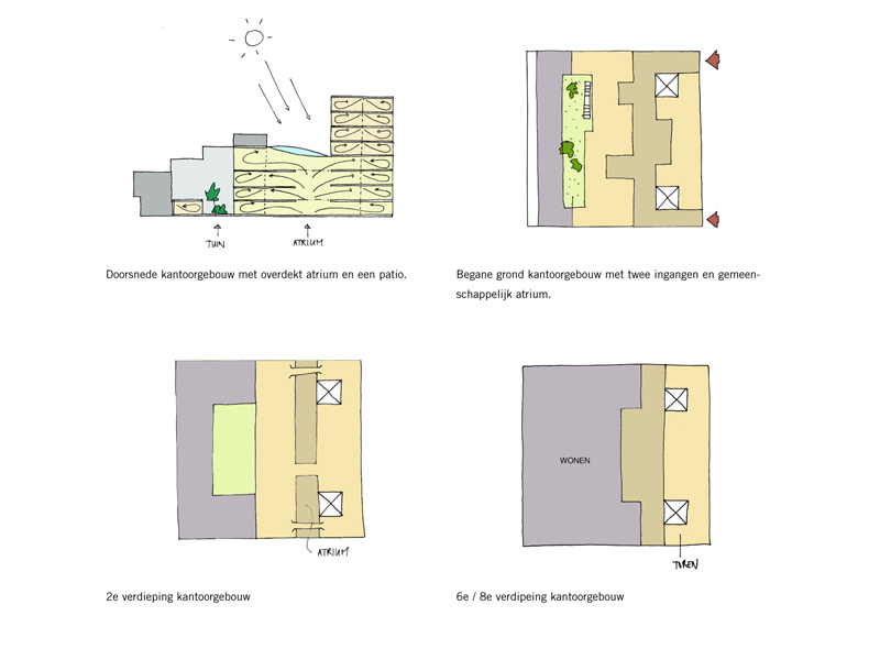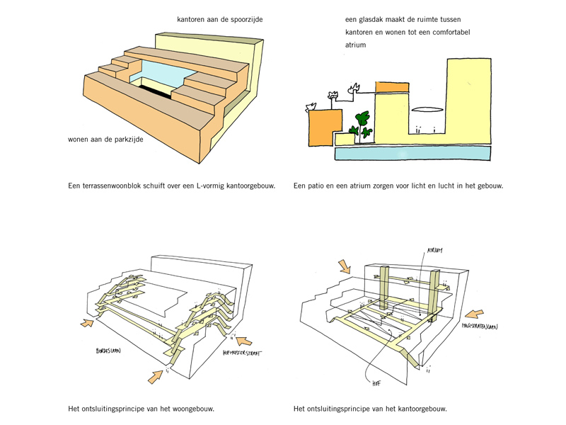 In dit ontwerp voor 12.000 m2 kantoren en 42 woningen in het stedenbouwkundig plan “Paleiskwartier” van bureau Khandekar wordt de vermenging van wonen en werken op gebouwniveau nagestreefd, wat gezien de verschillende verdiepingshoogtes voor kantoren en wonen geen eenvoudige zaak is. Het hart van het blok is uitgehold met twee leegtes, die functioneren als een atrium en een patio. Informele functies, zoals kantines, entree’s en presentatiezalen vinden eromheen hun plaats, en gebruiken de aanwezige ruimte optimaal. Hierdoor is er op de hoger gelegen verdiepingen ruimte om de appartementen als een dak over het hart van het blok heen te schuiven. Hierdoor ontstaan terraswoningen met werkelijk private buitenruimtes en majestueus zicht op het ernaast gelegen park.