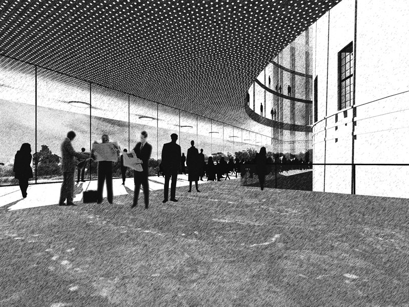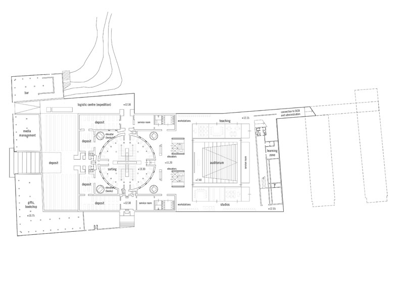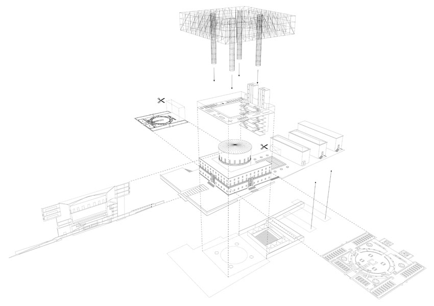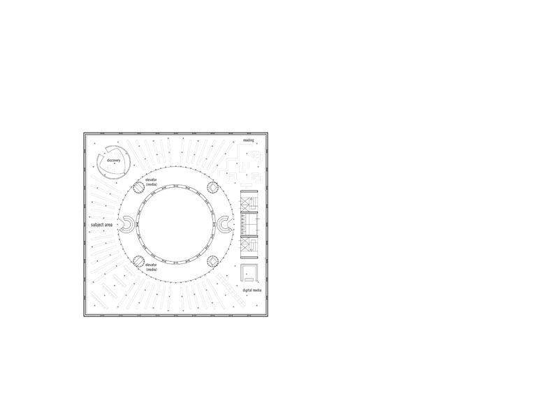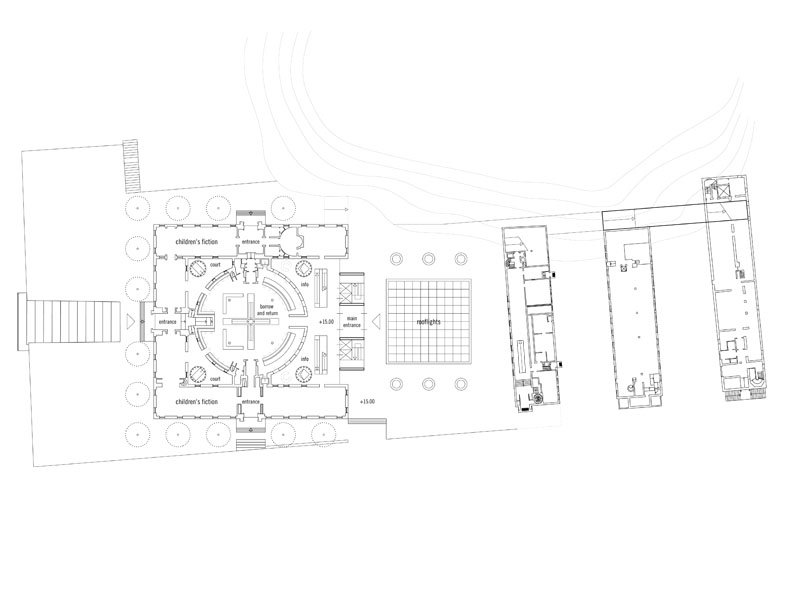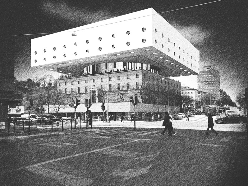 De door Asplund ontworpen bibliotheek van Stockholm is een Zweeds icoon, dat bankbiljetten siert. De opgave om dit relatief kleine gebouw uit te breiden met een tweemaal zo groot volume aan de achterzijde heeft als keerzijde dat het icoon de achterzijde zou kunnen worden en de uitbreiding de voorzijde. In ons voorstel wordt de iconografische werking van de bibliotheek vergroot door het gebouw rondom de ronde leeszaal zwevend boven het dak uit te breiden. Tussen oudbouw en uitbreiding ontstaat op het dak een openbaar toegankelijk plein met prachtige uitzichten op de stad, de oorspronkelijke bibliotheek en het interieur van de uitbreiding.