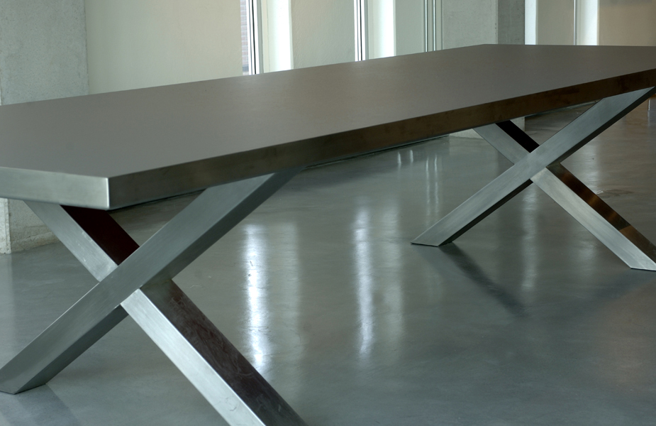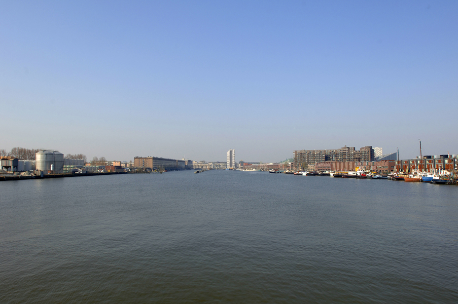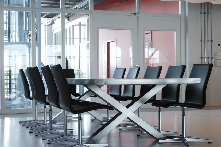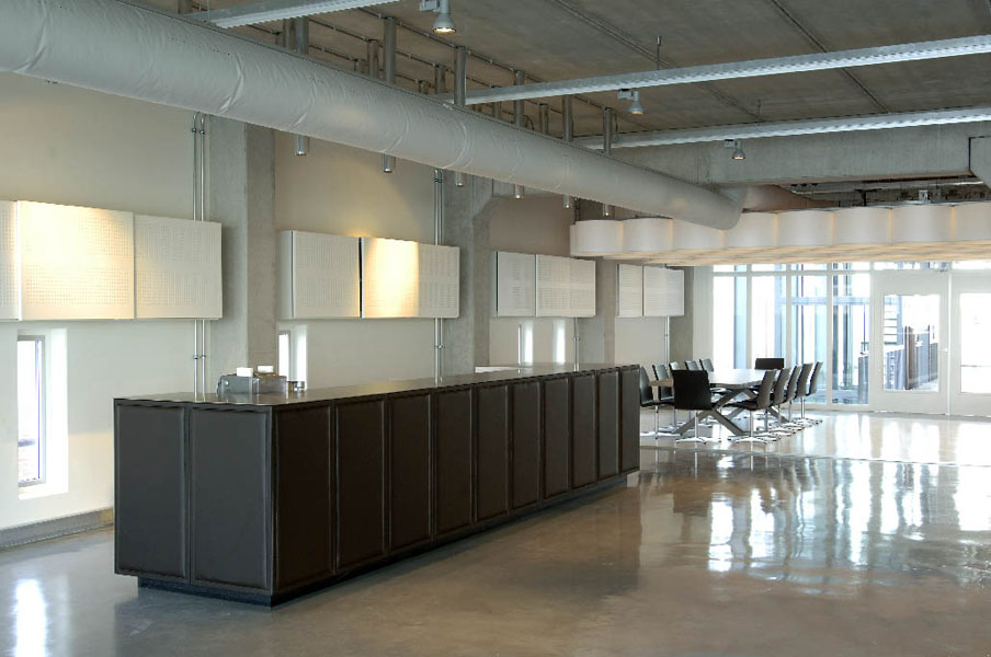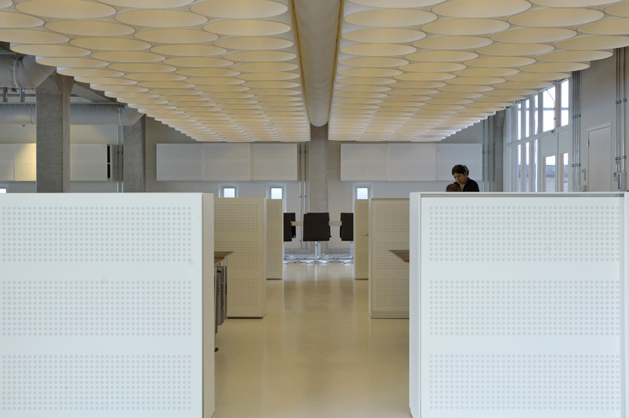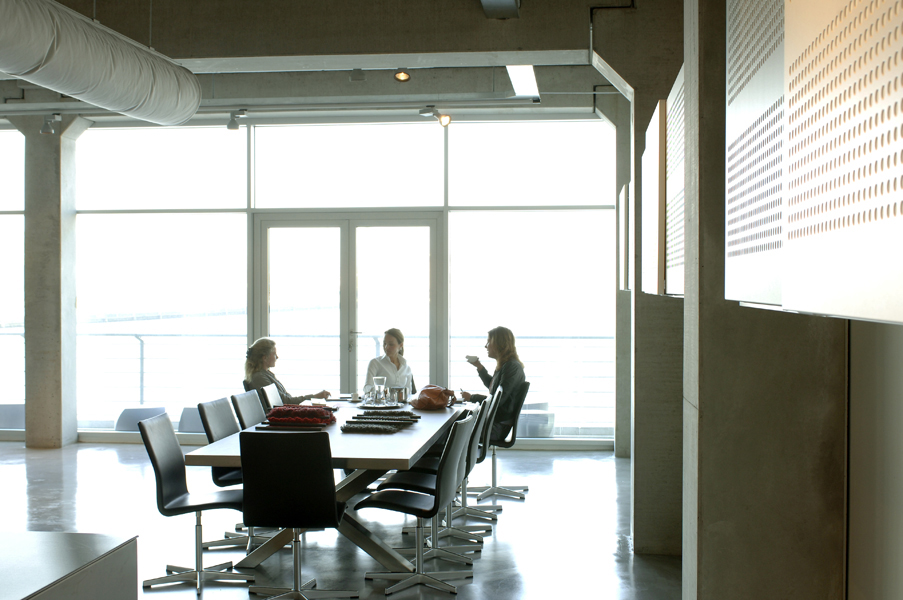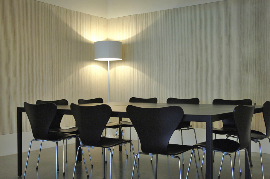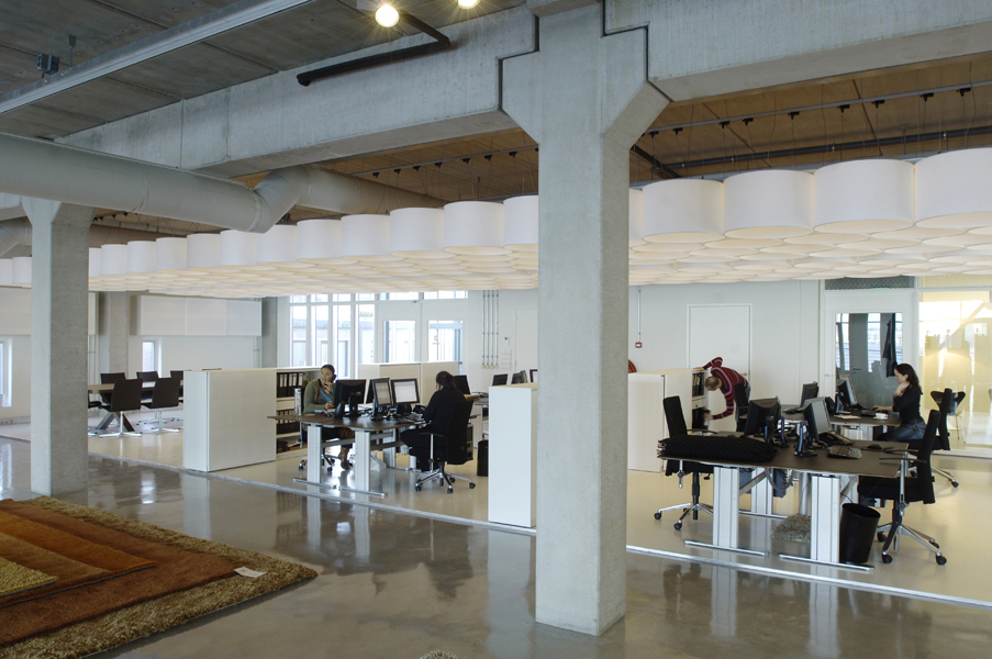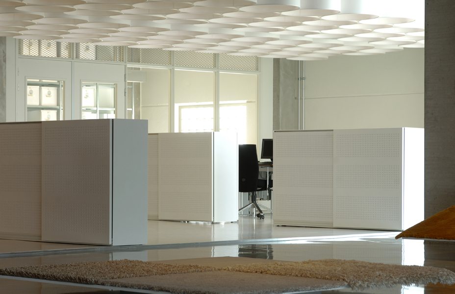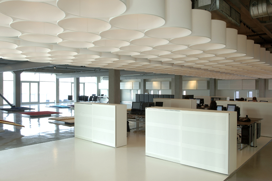 Met een verlaagd plafond van 276 simpele witte lampenkappen is de werkruimte afgebakend van de showroom. De slechte acoustiek van de cascoruimte is met dit plafond doeltreffend aangepast om op een relatief klein oppervlak veel werkplekken te realiseren. Hierdoor is de showroom maximaal groot en krijgen de carpetten alle ruimte die ze nodig hebben. Haaks op de werkplekken zijn twee tafels en een keuken geplaatst, die de bezoeker bij binnenkomst meteen naar het prachtige uitzicht begeleiden. Langs deze strook zijn aan de wand kasten gemonteerd met fronten waarin acoustisch materiaal is opgenomen.