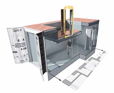 Zowel in het exterieur als het interieur lijkt er van een verandering van het bestaande woonhuis geen sprake. Dit alles verandert zodra de drie deuren van de uitbreiding gebruikt worden. Dan ontstaan er onverwachte connecties, zoals een rondgang over de begane grond, diagonaal naar boven een connectie tussen het atelier, via het dakterras, naar de woonkamer.