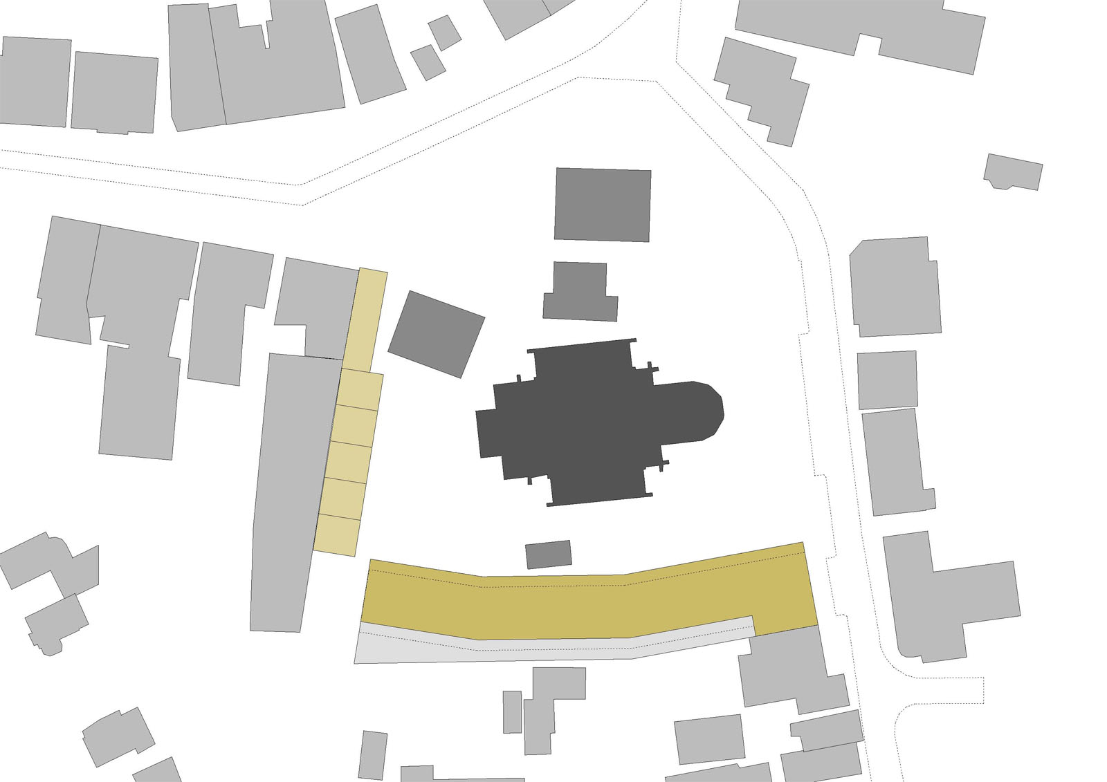 Een onderzoek naar de herontwikkeling van twee kavels aan weerszijden van de kerk heeft geleid tot een visie op het totaal van de mogelijke ontwikkelingen in dit gebied. In onze visie is het mogelijk om het kleine door parkeren gedomineerde plein filnk te vergroten en een aantal gebouwen rondom de kerk te ontdoen van hun "aangekoekte" bijgebouwen en deze samen met de kerk als losse objecten op het plein te plaatsen, waar de ruimte en routes "tussen door spoelen".