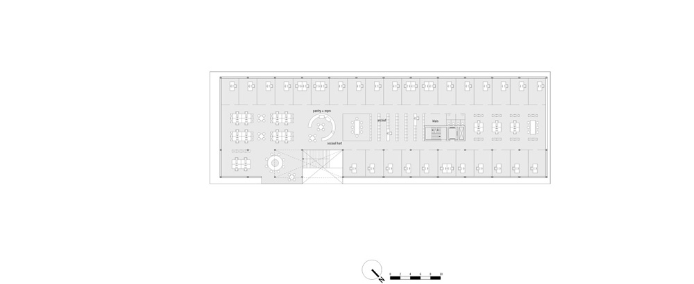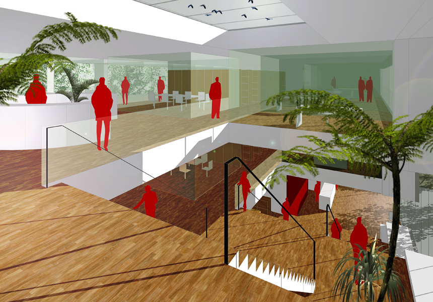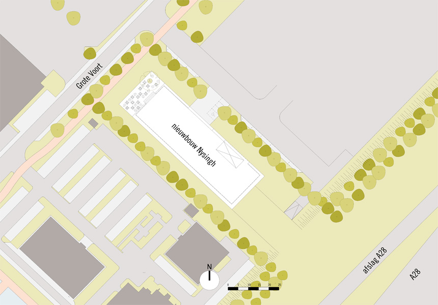 In opdracht van M7 Development heeft FRANTZEN et al het ontwerp gemaakt om de aanbesteding van dit advocatenkantoor te winnen. De locatie voor het gebouw is nu nog een anonieme strook braakliggend land achter een dichte groenwal langs de A28. We hebben een slimme stedenbouwkundige opzet ontwikkeld, waarbij de groenwal wordt onderbroken en er door de aanplant van bomen “landschappelijke kamers” met een hoge attentiewaarde ontstaan. Het gebouw is vervolgens als een licht paviljoen tussen de bomen geplaatst, waardoor de gebruikers de illusie hebben dat zij midden in de natuur werken. In de vormgeving van het gebouw vallen vooral de dubbele vloerranden op waarachter alle plafonds in installaties zijn weggewerkt. De monumentale trap is het hoofdmotief in de verbijzondering van deze gevel, die hier wel iets weg heeft van het computerspel “TETRIS”.